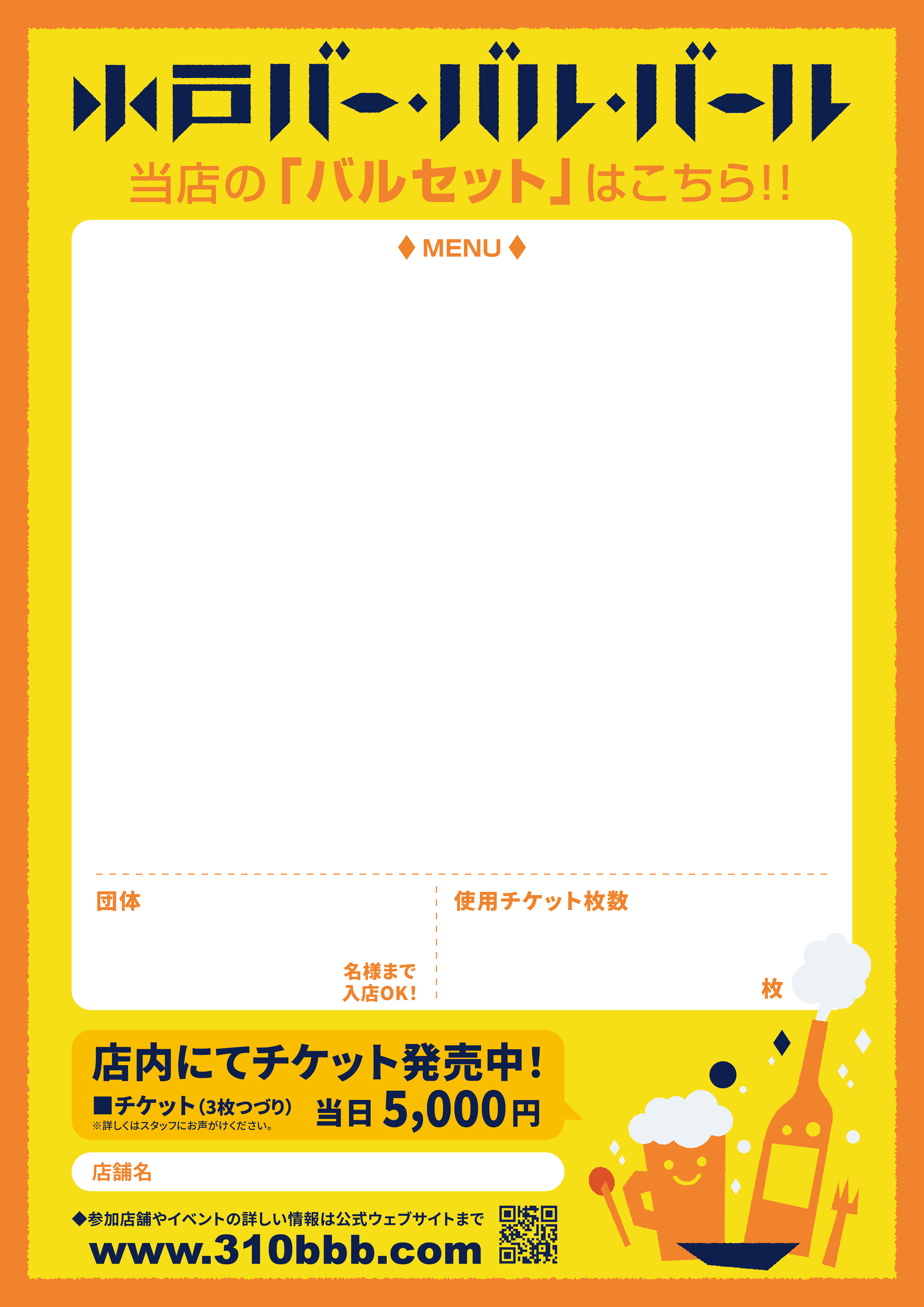 - 参加者が購入した「バルチケット」を使用し、参加店でドリンクとフードがセットになった「バルセット」を味わう飲み歩きイベント