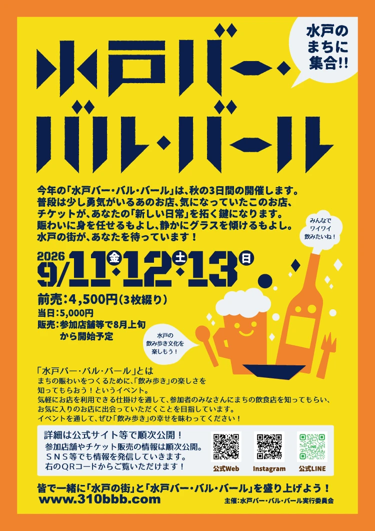 水戸の飲み歩きイベントとして2011年秋に初開催し、これまで15回にわたり開催してきた「水戸バー・バル・バール」(以下、310bbb)を、この秋に開催いたします。参加する方々に「飲み歩き」の楽しさを知ってもらう目標はこれまでと同様に、本イベントによって街なかの魅力発信に繋げたいと考えております。